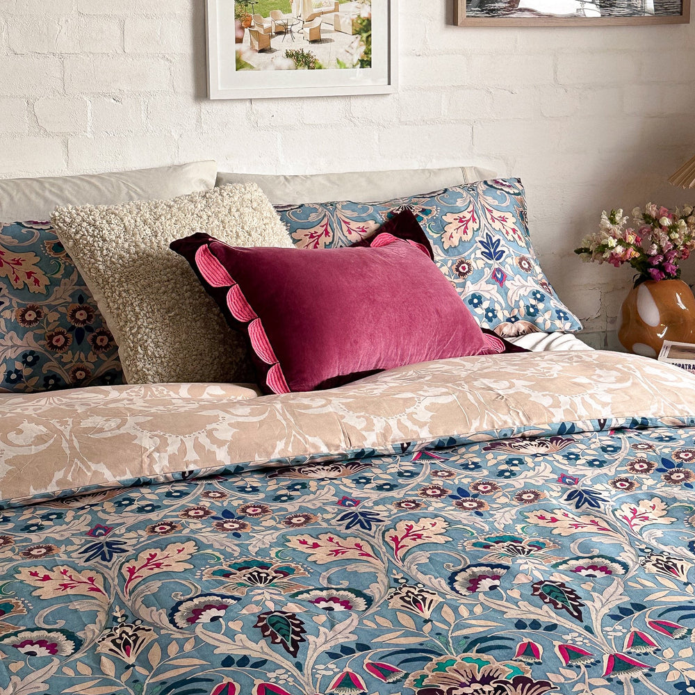 Create a contemporary bohemian vibe with Alina quilt cover set. The intricately painted design is scattered with pop colours to give the traditional motives a modern feel while the cotton sateen fabrication adds a sense of luxury. The reverse print in neutral tones completes the look.