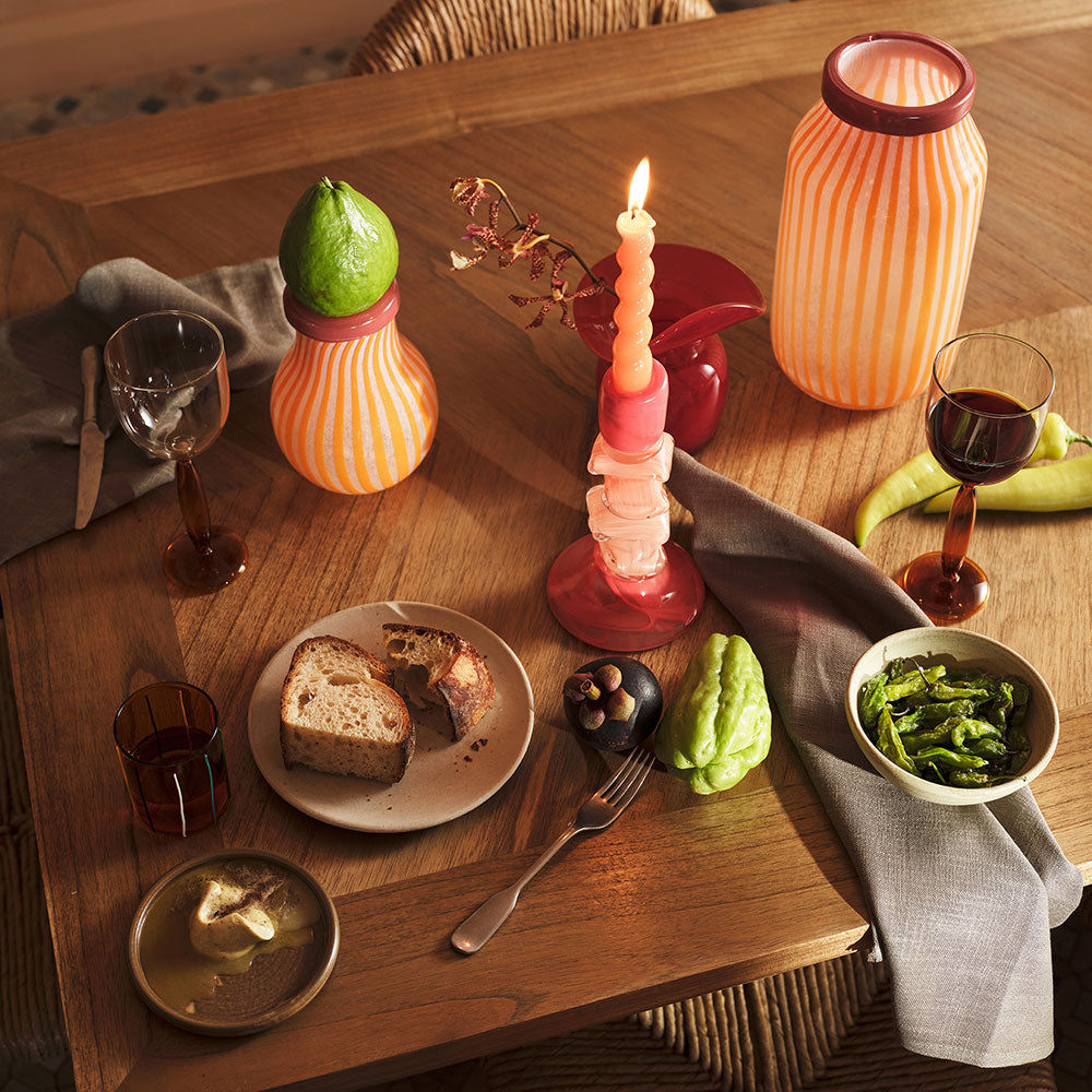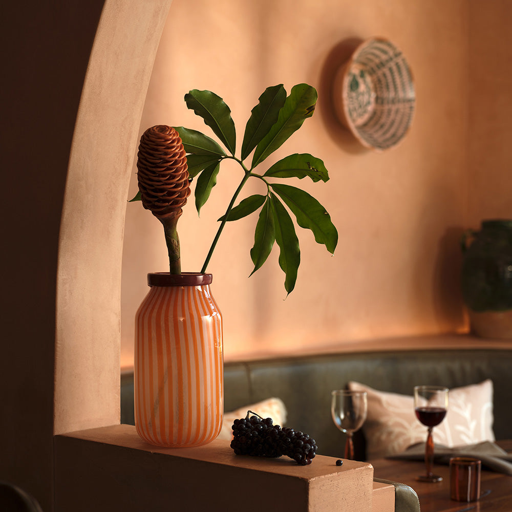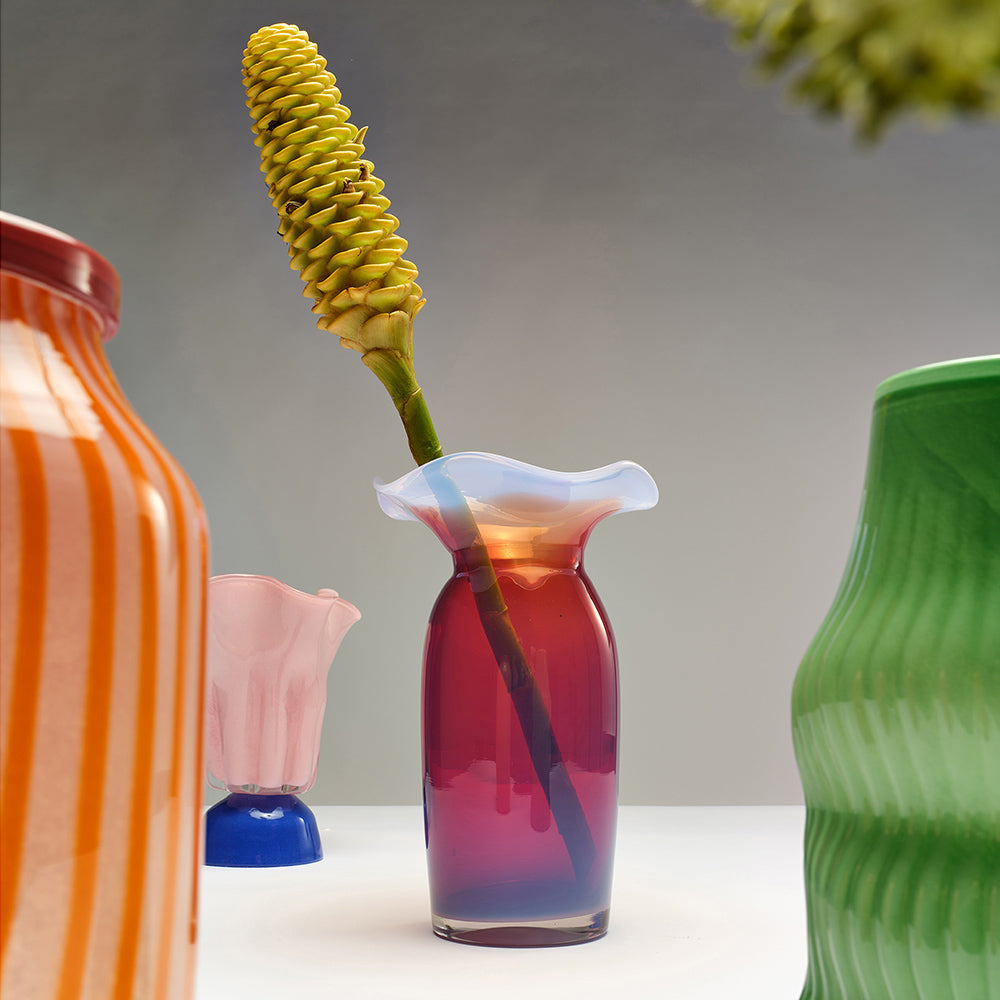 The Frances Large Vase is where form meets function in exquisite harmony. Featuring a subtle tonal pinstripe design complemented by a contrasting solid-coloured rim, this vase is made entirely of coloured glass and is as practical as it is stunning.