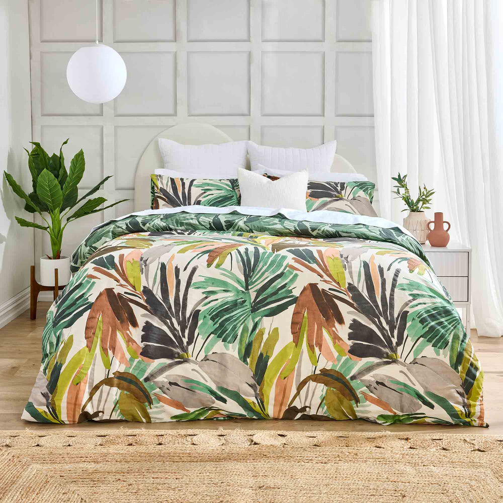 Transform your bedroom into a lush oasis with the Levara duvet cover set. Printed on a soft cotton sateen base, the gestural leaves evoke a tropical paradise while the contrast reverse print adds a sense of nature’s luxury.