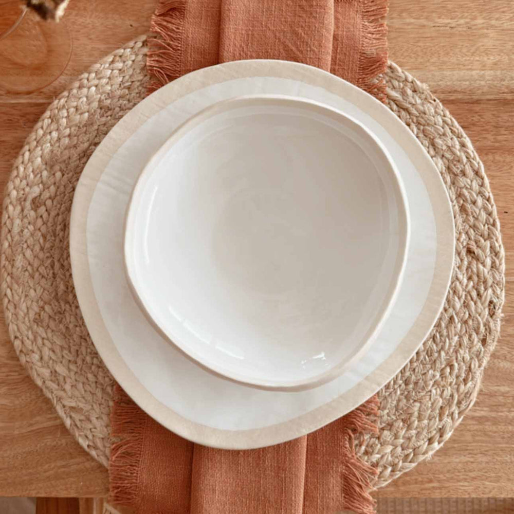 The organic linen dinnerware collection will give your next gathering an enviable rustic feel. Our artisans have handcrafted each plate and bowl in a charming two-toned mixture of white and cream for a modern and homely look.